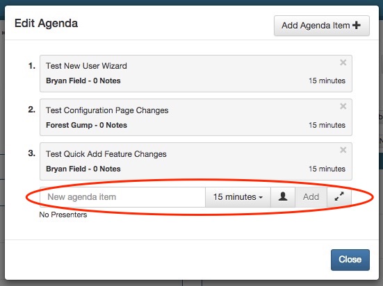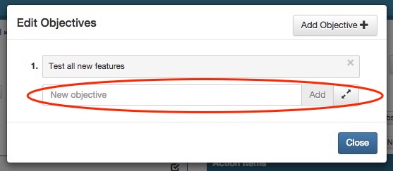 - Added new quick add feature for Objectives and Agenda Items when planning a meeting. This features streamlines the planning process and allows you to rapidly add Objectives and Agenda Items.